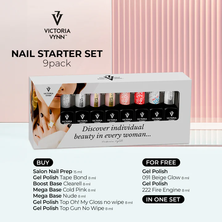De Victoria Vynn 9‑pack Starter Set is een complete nagelset waarmee je thuis of in de salon een professionele gellak‑manicure kunt maken. De set bevat een combinatie van voorbereidingsproducten, basis‑ en topcoats én klassieke kleur‑gellakken. Door de slimme samenstelling van deze producten wordt zowel de hechting als de afwerking van jouw gellak verbeterd.
