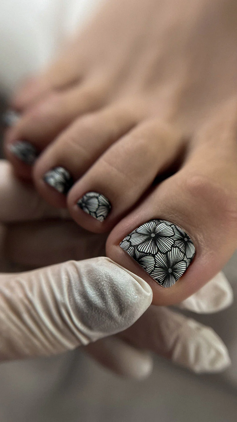 6. Breng het naar de nagel en plaats het net voor de nagelriem. Verwijder volledig de witte filmen plaats de slider op naar de nagel. De slider rekt